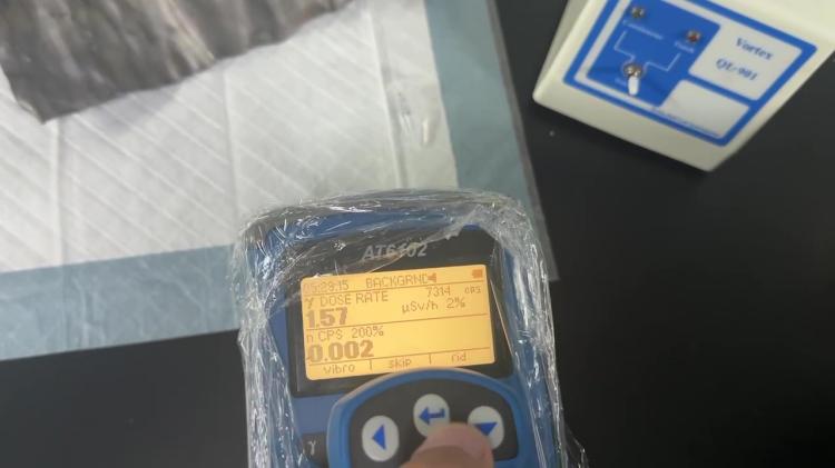 隨后使用AT6102對實(shí)驗室中的輻射源樣本進(jìn)行了測試。儀器迅速顯示了監(jiān)測到的數(shù)據(jù),展示了AT6102在環(huán)境輻射監(jiān)測中的高效性和準(zhǔn)確性。